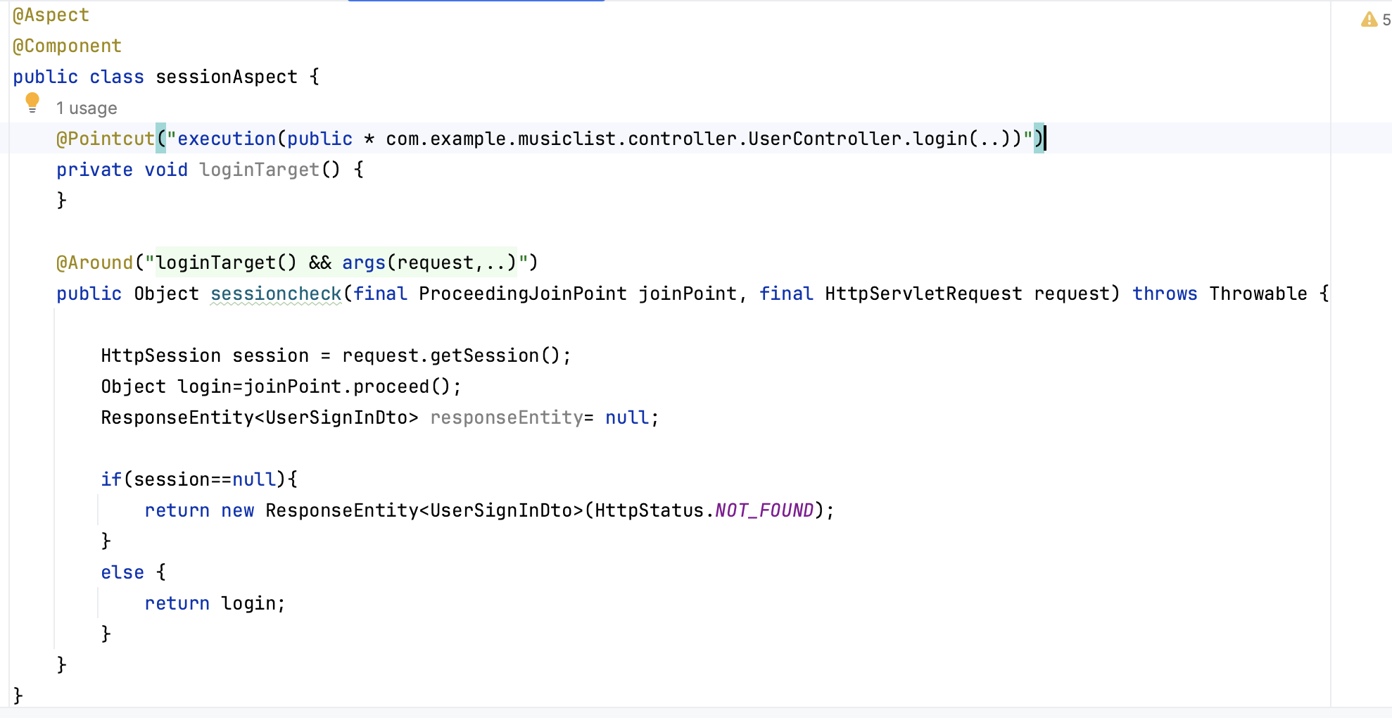 세션이 존재하는지 체크를 한 후 존재하면 jointPoint.proceed()를 통해 비즈니스로직을 불러오고